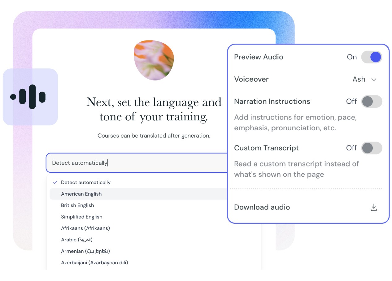 Scale your content globally with instant translation into 120+ languages. Make learning more accessible by adding engaging, lifelike AI narration.