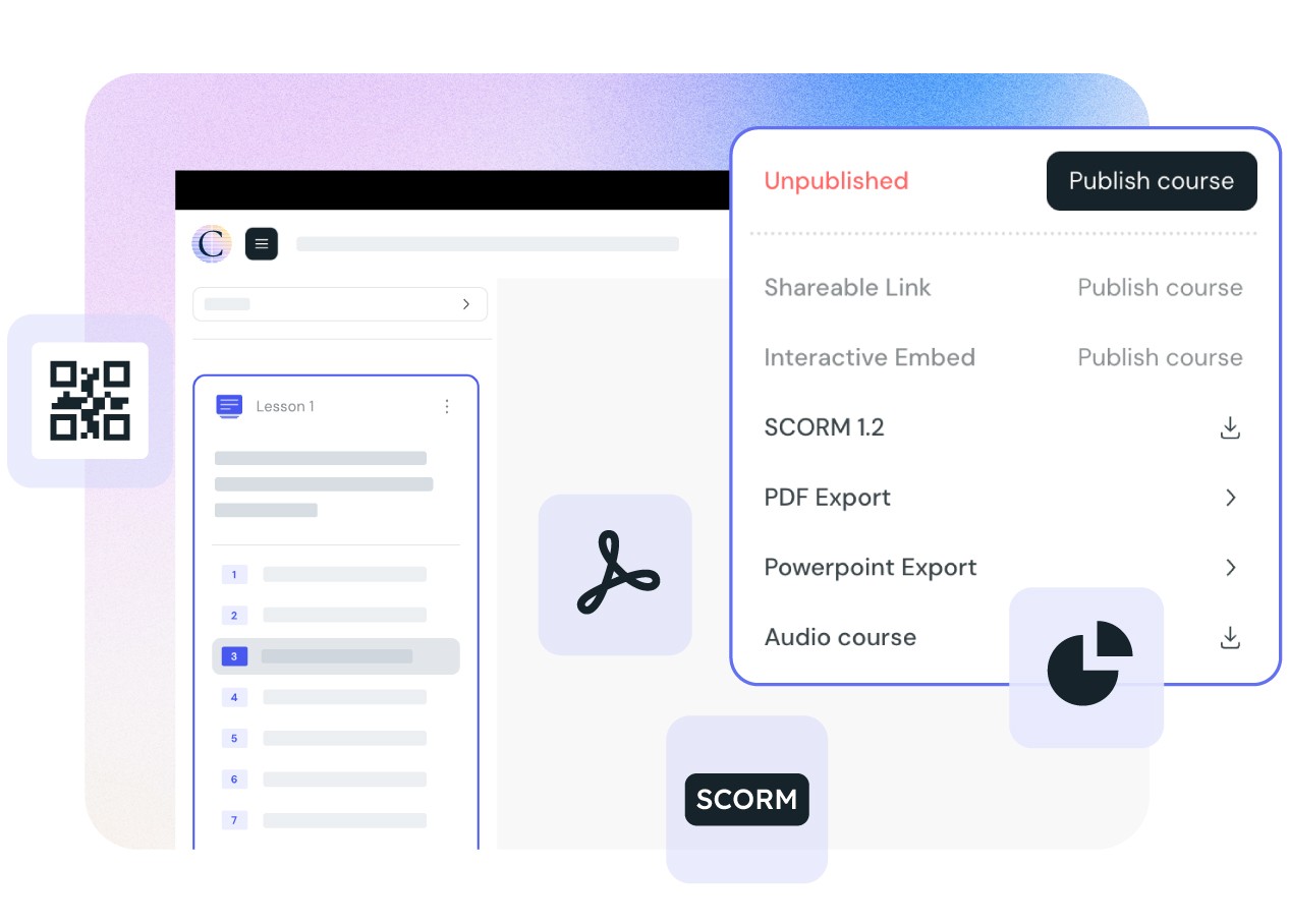 Your content deserves to be seen. Export via SCORM for full delivery and tracking in your LMS, or share instantly with a web link, QR code, editable PowerPoint, or live embed.
